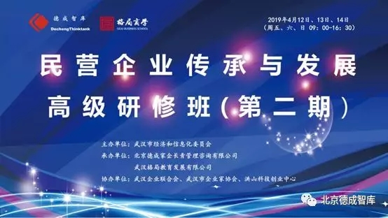 由武漢市經(jīng)濟(jì)和信息化局主辦、北京德成家企長(zhǎng)青管理咨詢有限公司、武漢格局教育發(fā)展有限公司承辦“民營企業(yè)傳承與發(fā)展高級(jí)研修班”(第一期)”,定于2019年11月15日、16日、17日在武漢市洪山區(qū)書城路26號(hào)洪山科技創(chuàng)業(yè)中心A棟216舉辦。